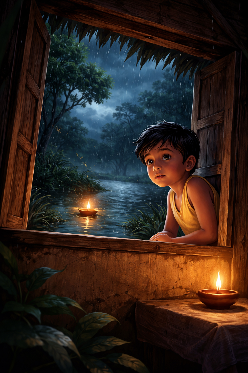 ভয় পেলেও টুনুর বুকের ভেতর কেমন মায়া জাগে। সে চুপিচুপি খালি পায়ে পুকুরঘাটে যায়। জল তখন স্থির, কিন্তু তার হৃদয় ধকধক করছে। প্রদীপটা হঠাৎ নিভে যায়, আর চারপাশ অদ্ভুত নীরবতায় ভরে ওঠে…